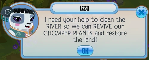 1. When the adventure starts, Liza will announced to start the journey, telling the histrion that they must articulate the polluted river to water the Chomper Plants, which the Phantoms have withered.